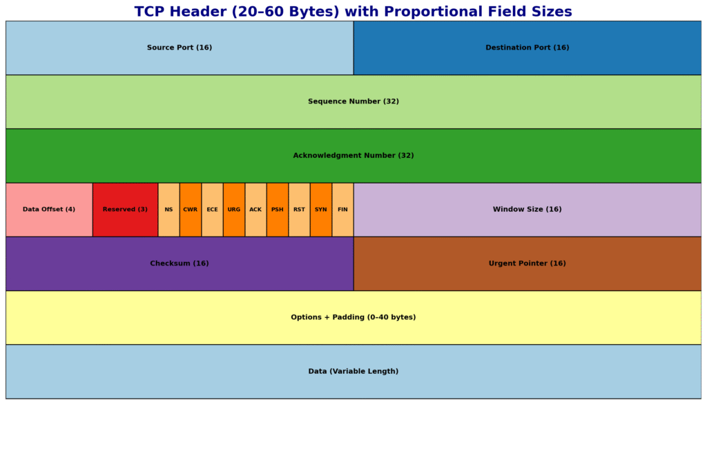 - Options (0–40 bytes): Extend TCP functionality. Common options include MSS (Maximum Segment Size), Window Scaling, Selective Acknowledgment (SACK), and Timestamps.