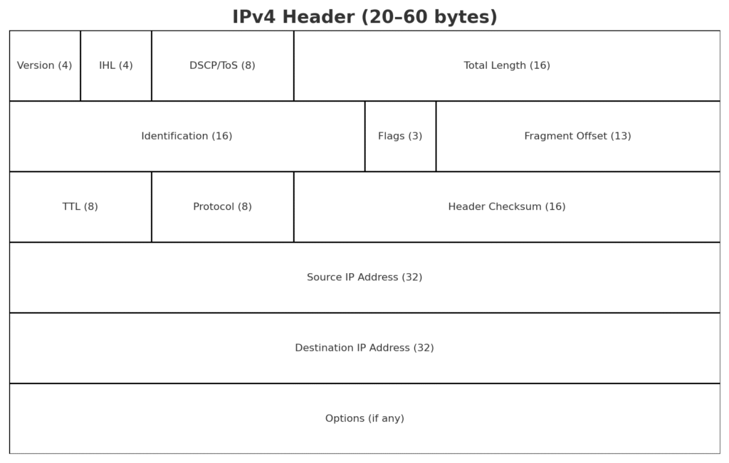 - Options (optional): Rarely used, increases header size up to 60 bytes.