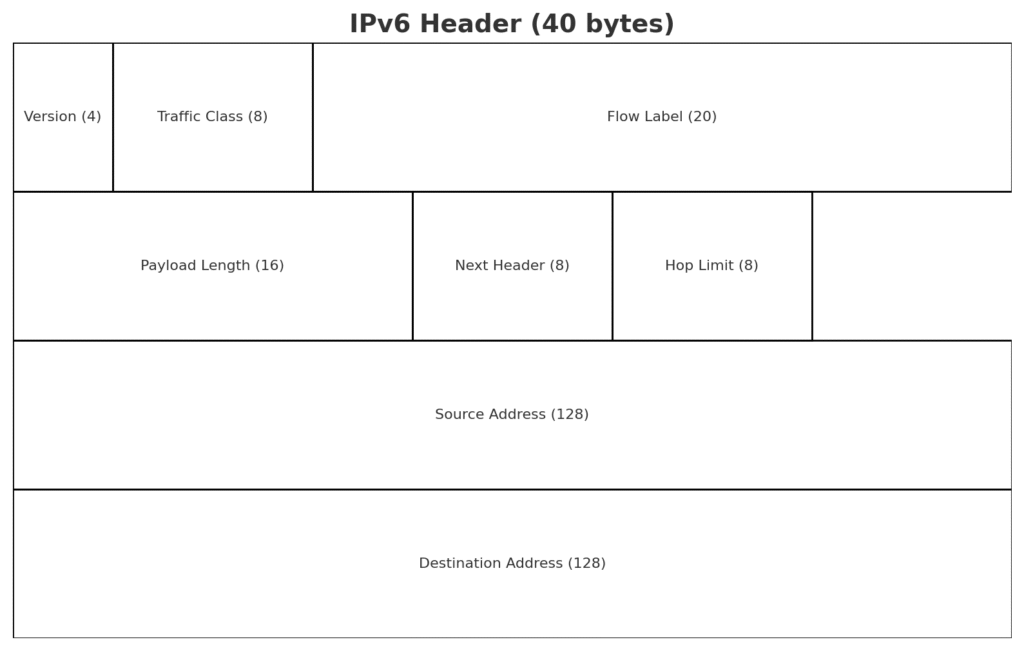 - Header size: IPv4 = variable (20–60 bytes), IPv6 = fixed (40 bytes).